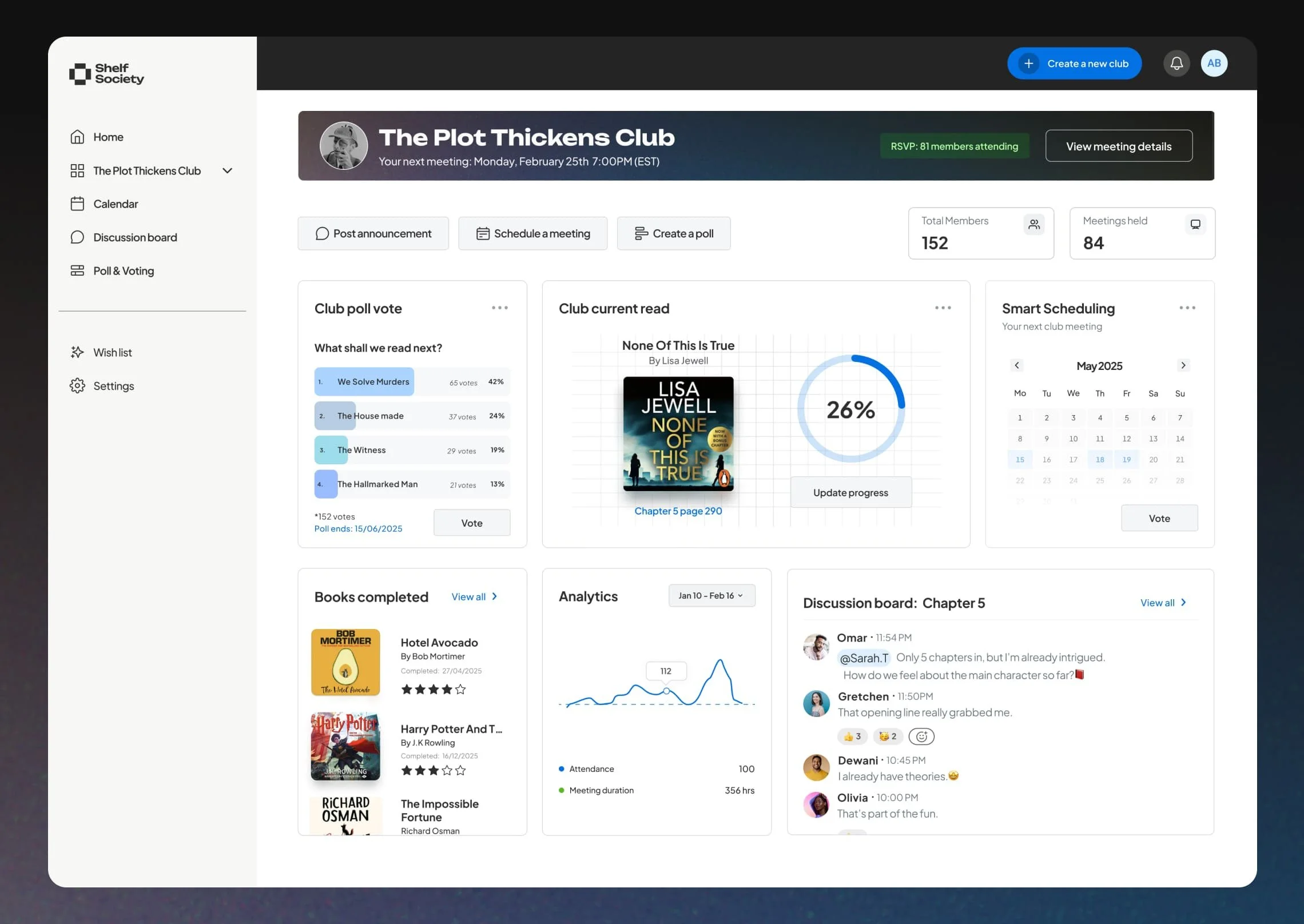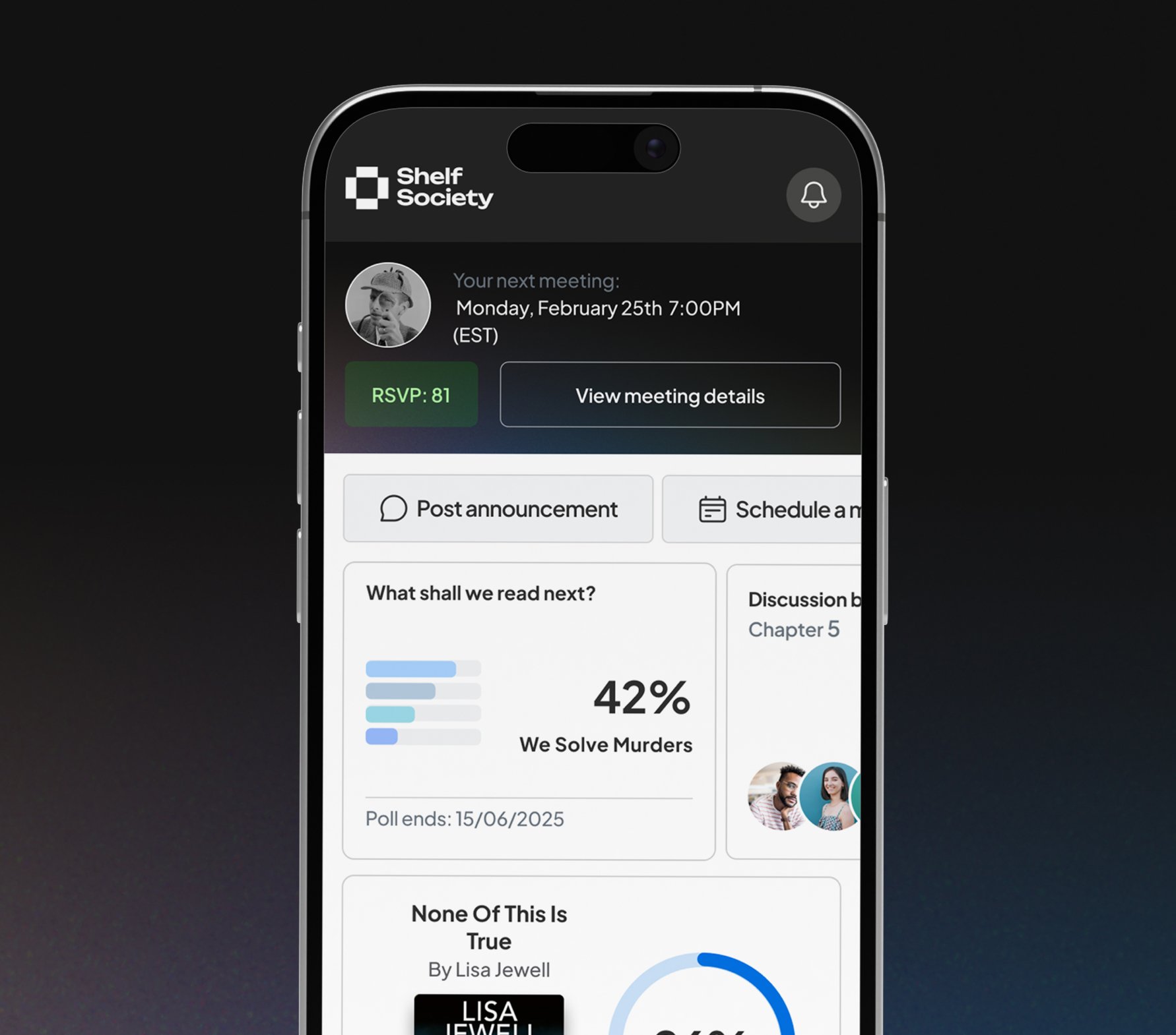 Shelf Society is a dedicated platform designed to make running a book club easier. By bringing scheduling, book selection, and discussion into one shared, well organised space, it supports book clubs before, during, and between meetings, helping shift the focus from planning logistics to connection and conversation.