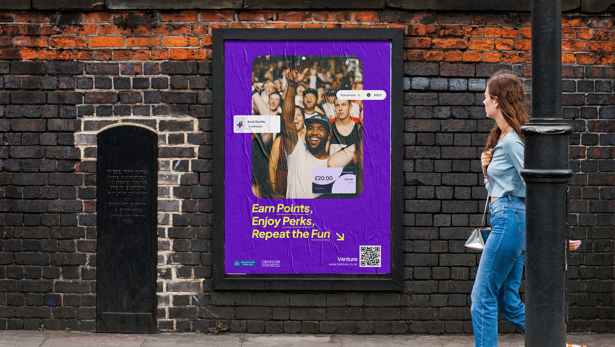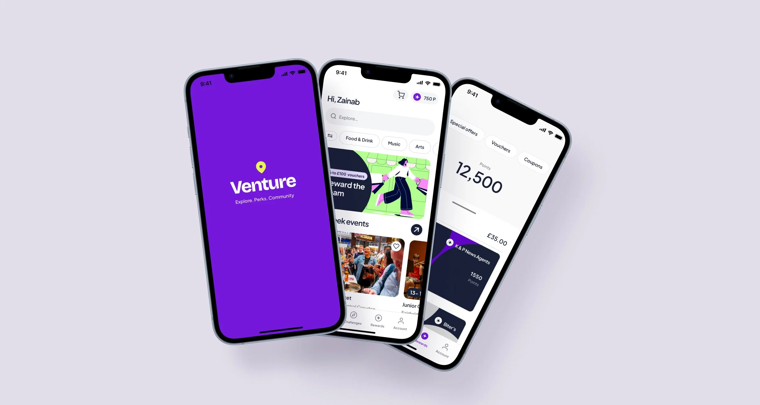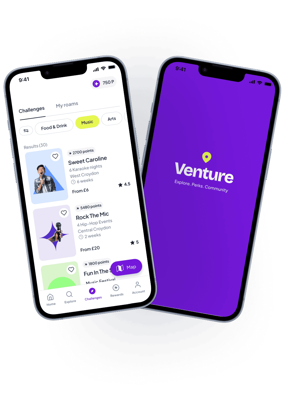 Venture encourages residents to explore their neighbourhood through themed challenges and reward-based incentives. Users discover experiences, commit to challenges, and earn points by visiting participating businesses. Bookable experiences such as restaurants can be reserved directly in the app, while other visits are verified in-store. By turning local exploration into a rewarding experience, Venture aims to drive repeat engagement and support independent businesses.